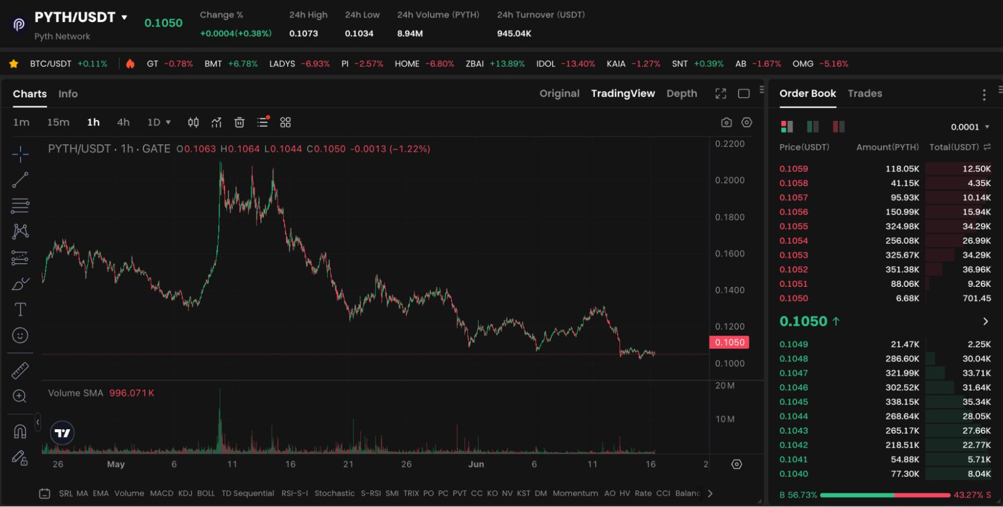 截至 2025 年 6 月 16 日,PYTH 价格约为 0.105 美元左右,近期波动较大,请谨慎交易,注意风险。
