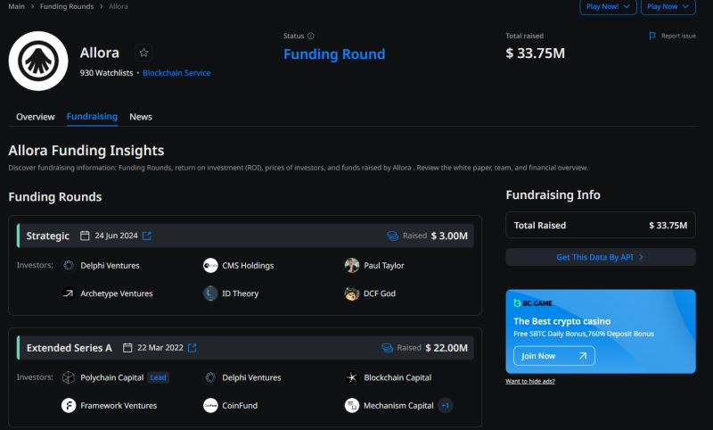 Allora Labs 已从 Polychain(领投)、Framework Ventures(领投)、Blockchain Capital(领投)、CoinFund、Delphi Ventures、Archetype、Slow Ventures、Mechanism Capital、CMS Holdings、ID Theory 等投资者处筹集了总计3375 万美元的资金。