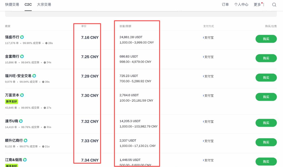 可以看到这里有快捷交易、C2C、还有大宗交易。“快捷区”它属于一个快捷渠道,是比较方便的。而“C2C”还有“大宗交易”,他们两个是比较类似的。区别就是大宗交易一般是针对于大额的交易,我们可以看到它的最低限额也是比较高的。