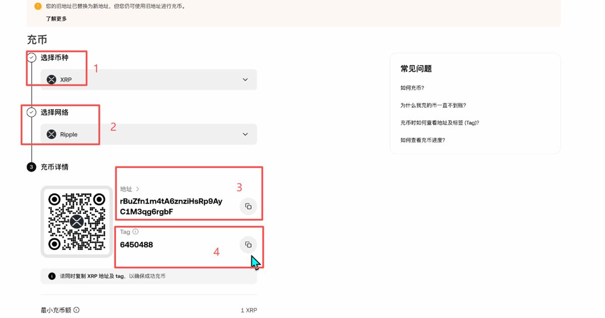 其实我们看绝大部分我们提的都是USDT这个币种,当然它还有其他的币种可以提,这里我们来看XRP这个比较特殊的币种。网络这里它有一个自己的专属网络。除了它的充币地址之外,它还有一个tag,也就是一串数字。你在其他地方提的时候,同时也要输入这个tag以及这个地址,才能够把XRP由其他交易所提到欧易交易所里面来。这个就是充币的环节。