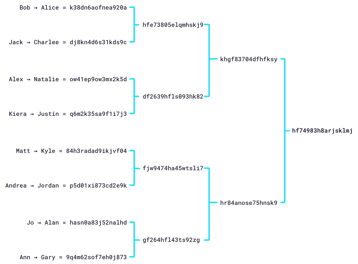 现在我们有了一组已被压缩成哈希值的交易数据。接下来,我们将哈希值两两配对,并为每对哈希值创建一个新的哈希值,从而进一步压缩这些数据。如此反复,直到整个交易数据都由一个单独的哈希值表示为止。