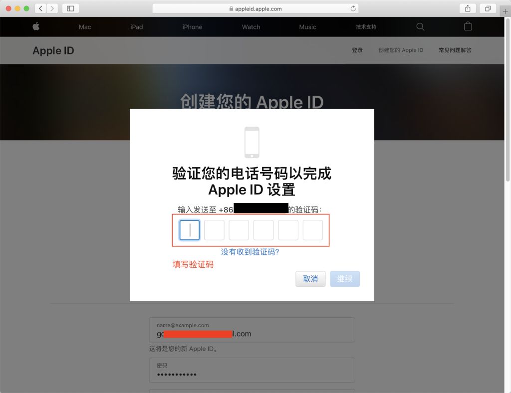 - 输入手机收到的短信验证码,点击”继续”